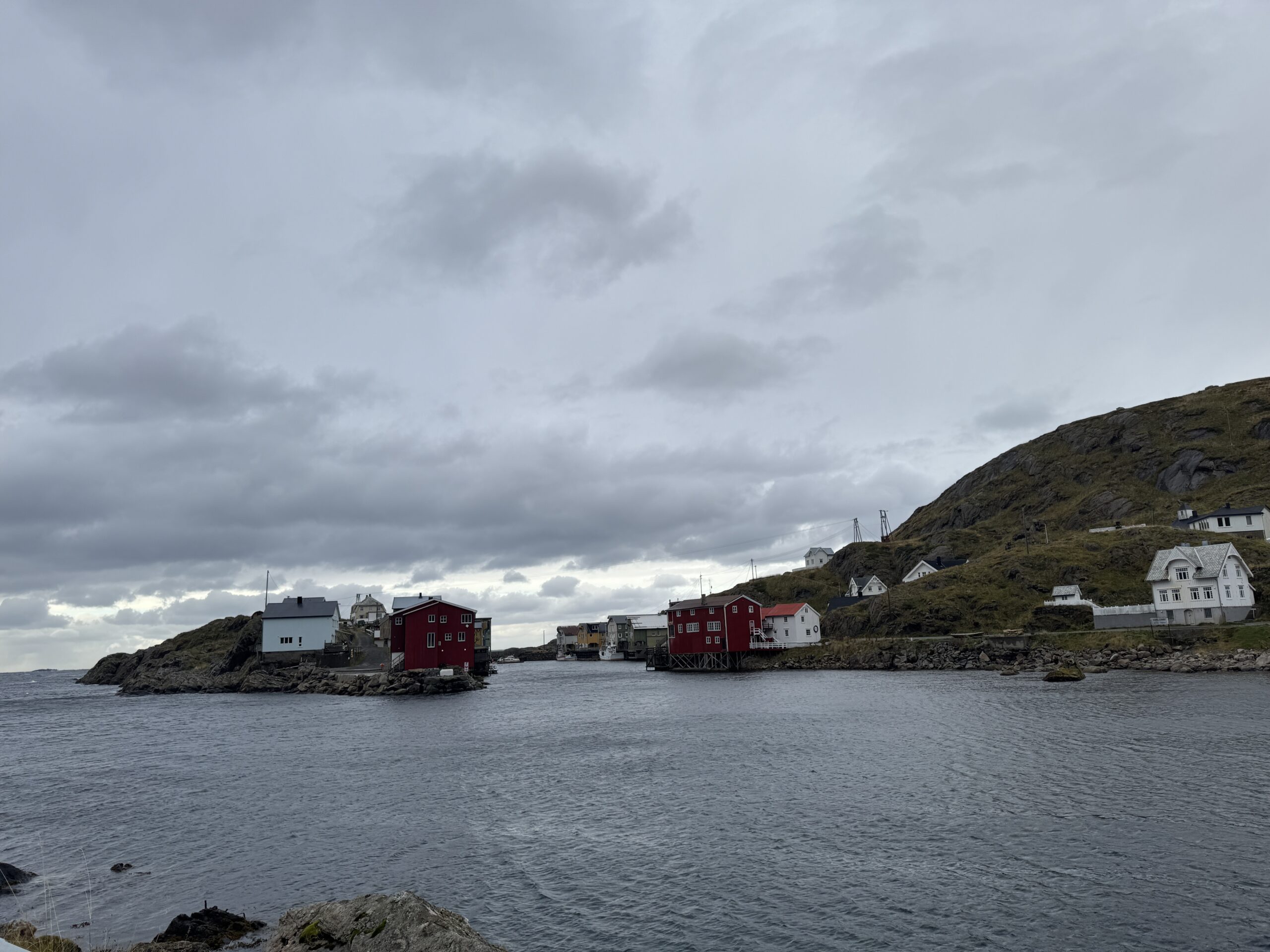 [29. September 2024] Unsere Ziel des Tages: Nyksund. Schon beim Losfahren war das Wetter eher ungemütlich – regnerisch und windig, wie man es hier oben in Nordnorwegen zu dieser Jahreszeit erwarten kann. Die herrliche stürmische Landschaft hatte aber auch ihren Charme – zumindest wenn man im Auto mit Sitzheizung sitzt. Die Scheibenwischer liefen allerdings auf Hochtouren.