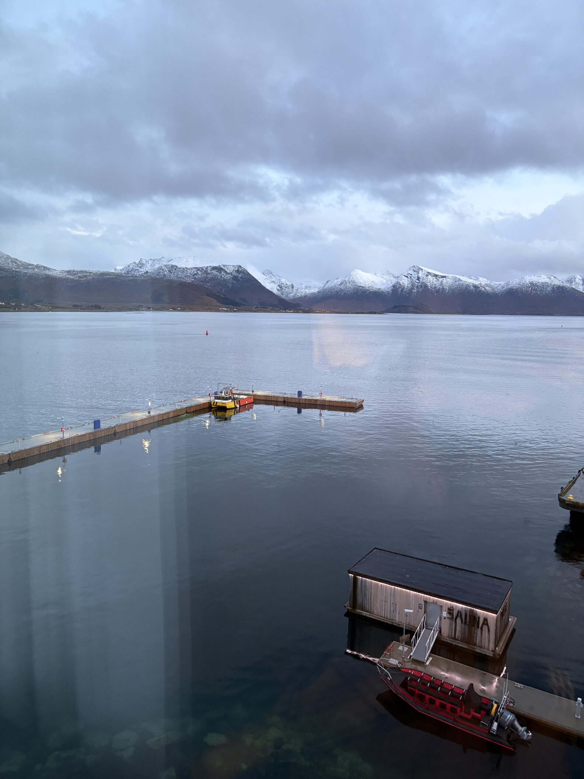 Nach unserem kurzen Abstecher in Nyksund machten wir uns schließlich auf den Weg nach Sortland. Die Fahrt dorthin war weniger stürmisch, und es blieb überwiegend trocken. Sortland, auch aufgrund der vielen blauen Häuser bekannt als „die blaue Stadt“, kann man aber lediglich als Stopp für eine Nacht empfehlen auch wenn das Hotel Scandic uns mit einem wundervollen Ausblick begrüßte.