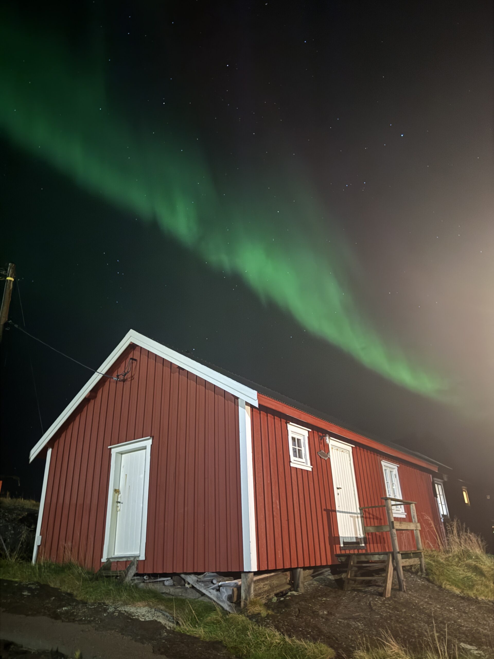 Zu unserer Überraschung wurde die Nacht wolkenfrei und klar. Wir blickten daher regelmäßiger aus dem Fenster, um vielleicht doch noch Nordlichter sehen zu können, denn die Prognosen sahen gut aus. Was soll ich sagen, den Haken auf der Bucket-List können wir hinter „Nordlichter gesehen“ machen. Direkt über unserer Fischerhütte konnten wir das leuchtend grüne Naturwunder bestaunen.