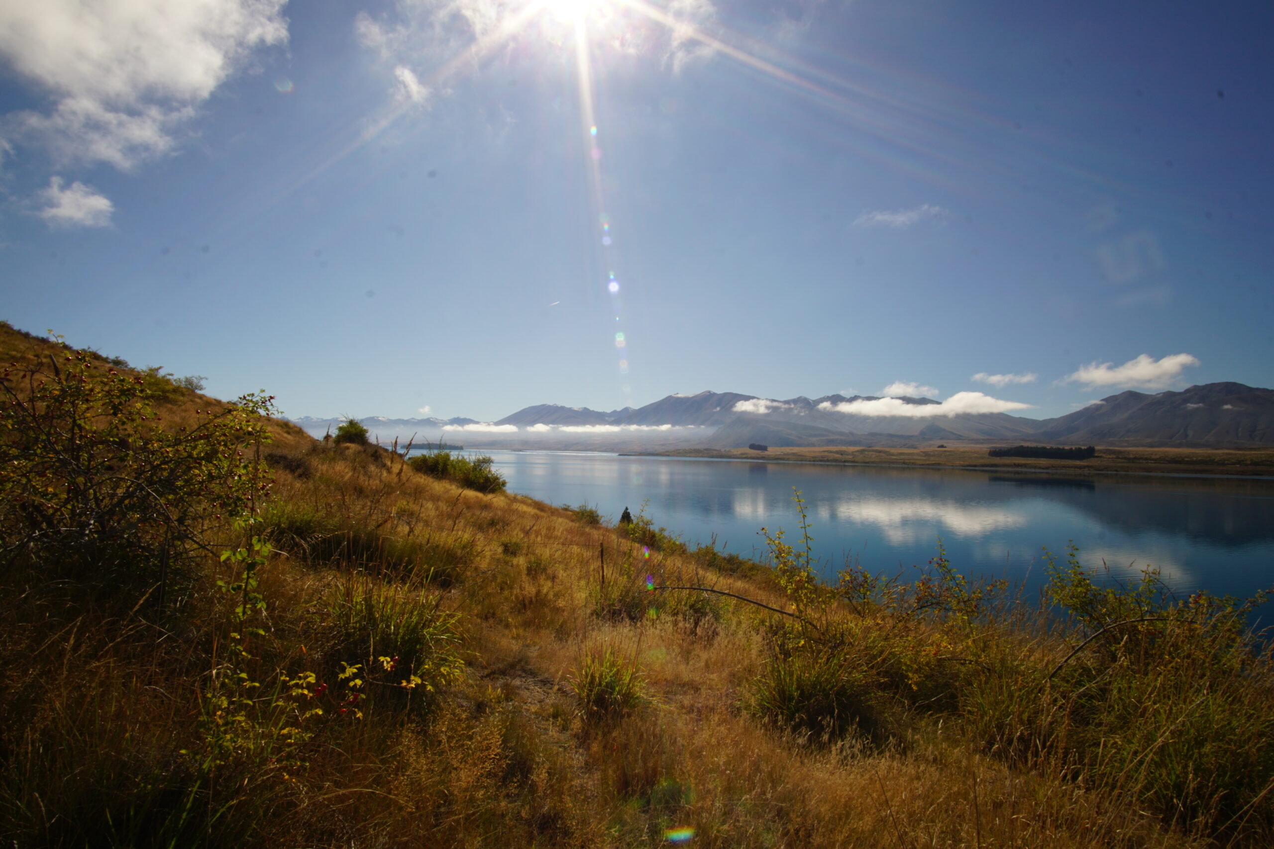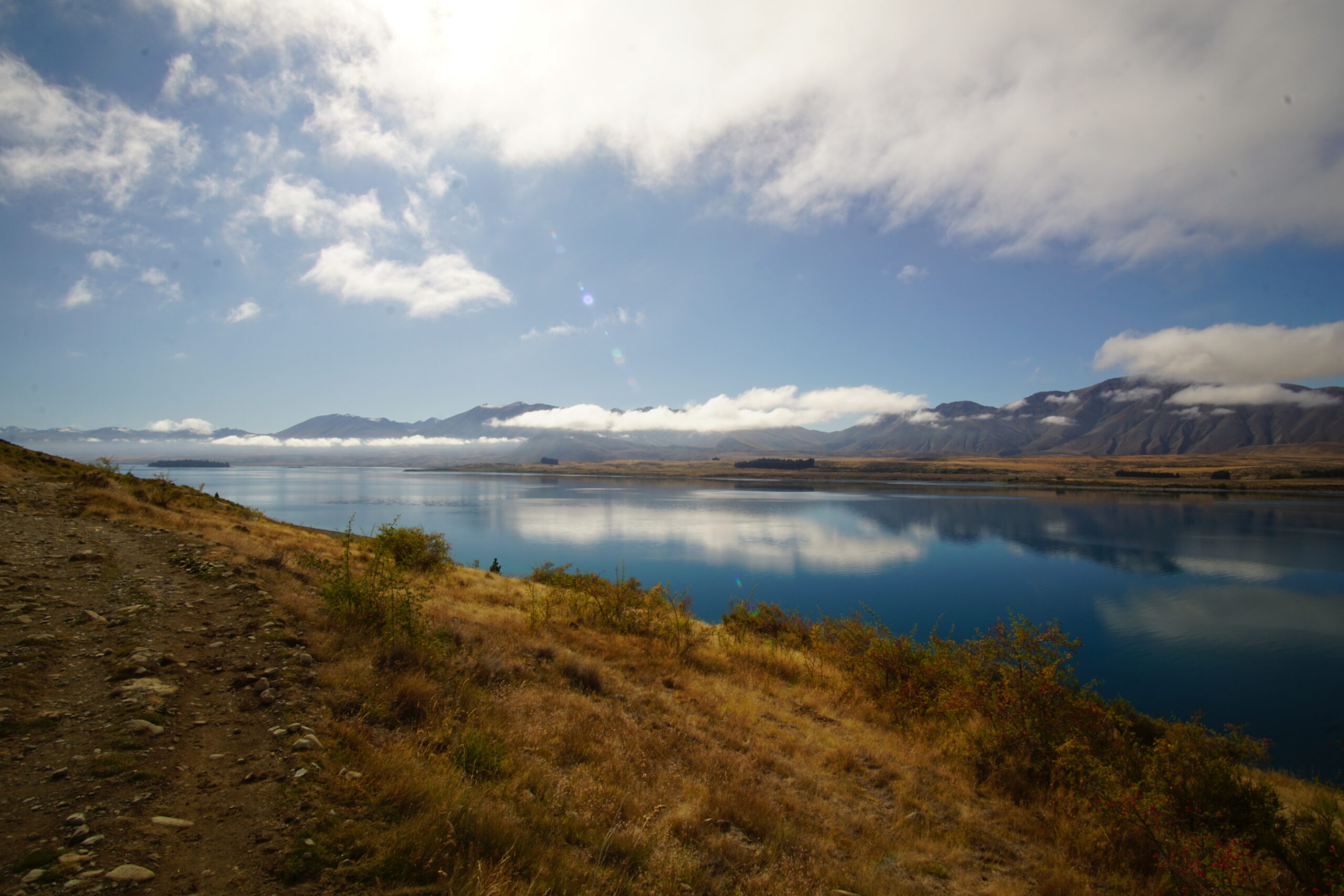 Von unserer Unterkunft aus machten wir uns zu Fuß auf den Weg. Der erste Abschnitt führte uns direkt am steinigen Ufer des Sees entlang bis zum westlichen Ende von Lake Tekapo. Der Morgen war noch leicht bewölkt, doch nach und nach verzogen sich die letzten Wolken, und gegen Mittag begrüßte uns wieder der strahlend blaue Himmel, den wir schon am Vortag erlebt hatten.