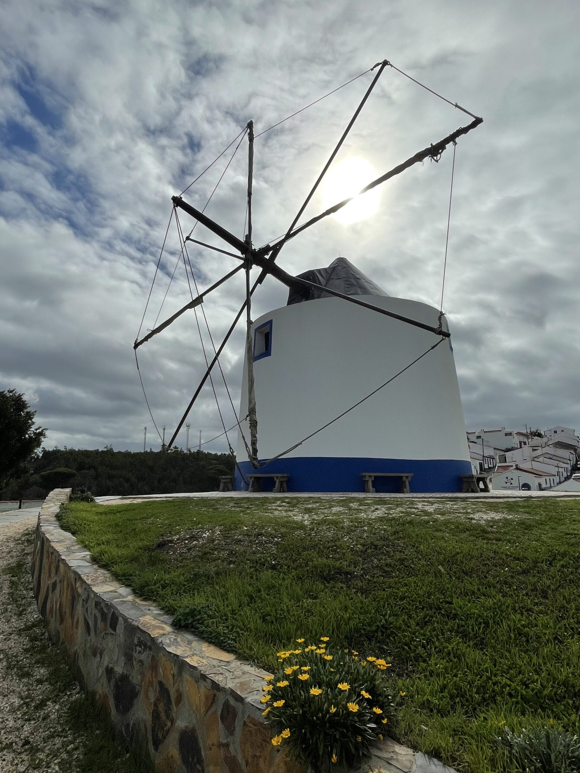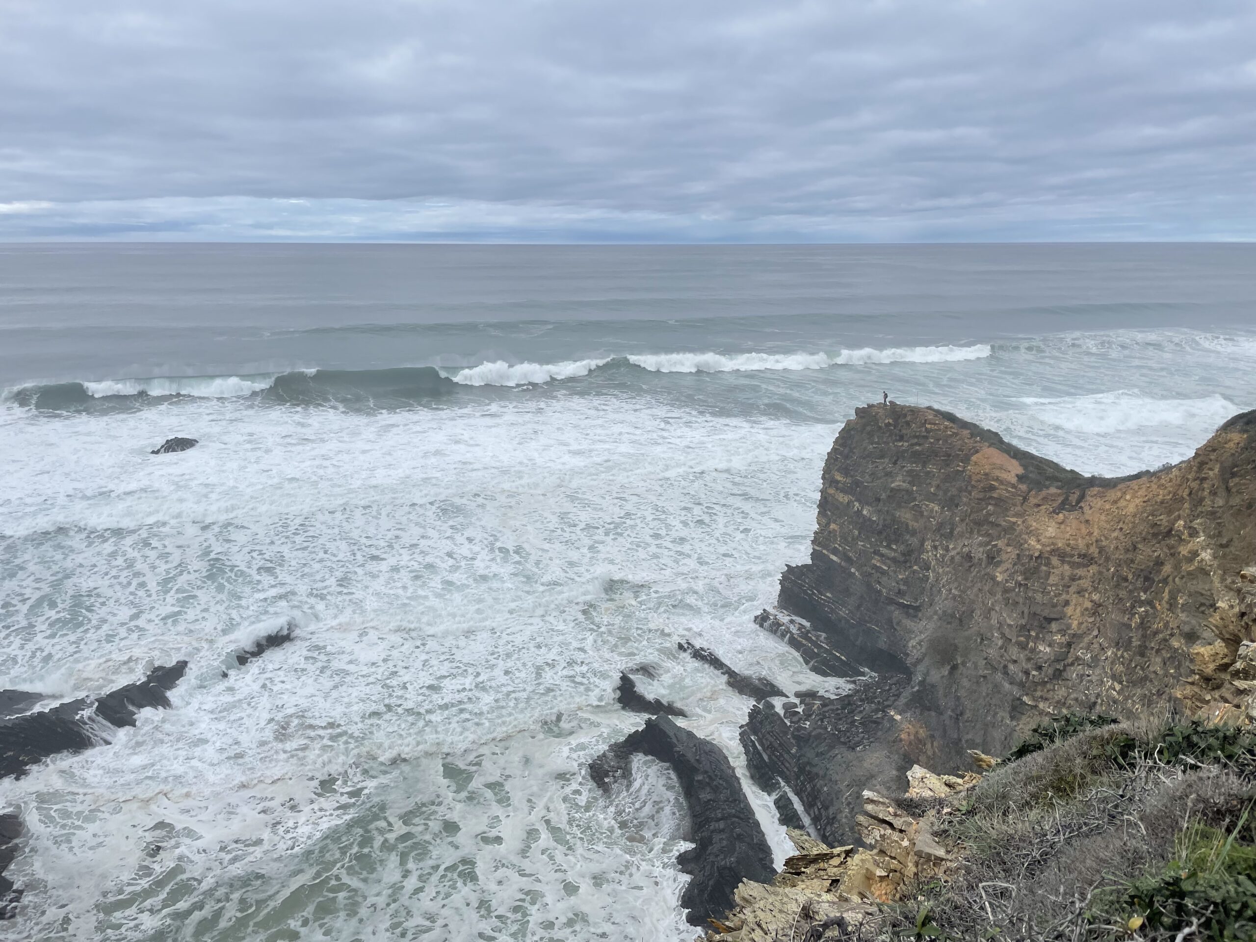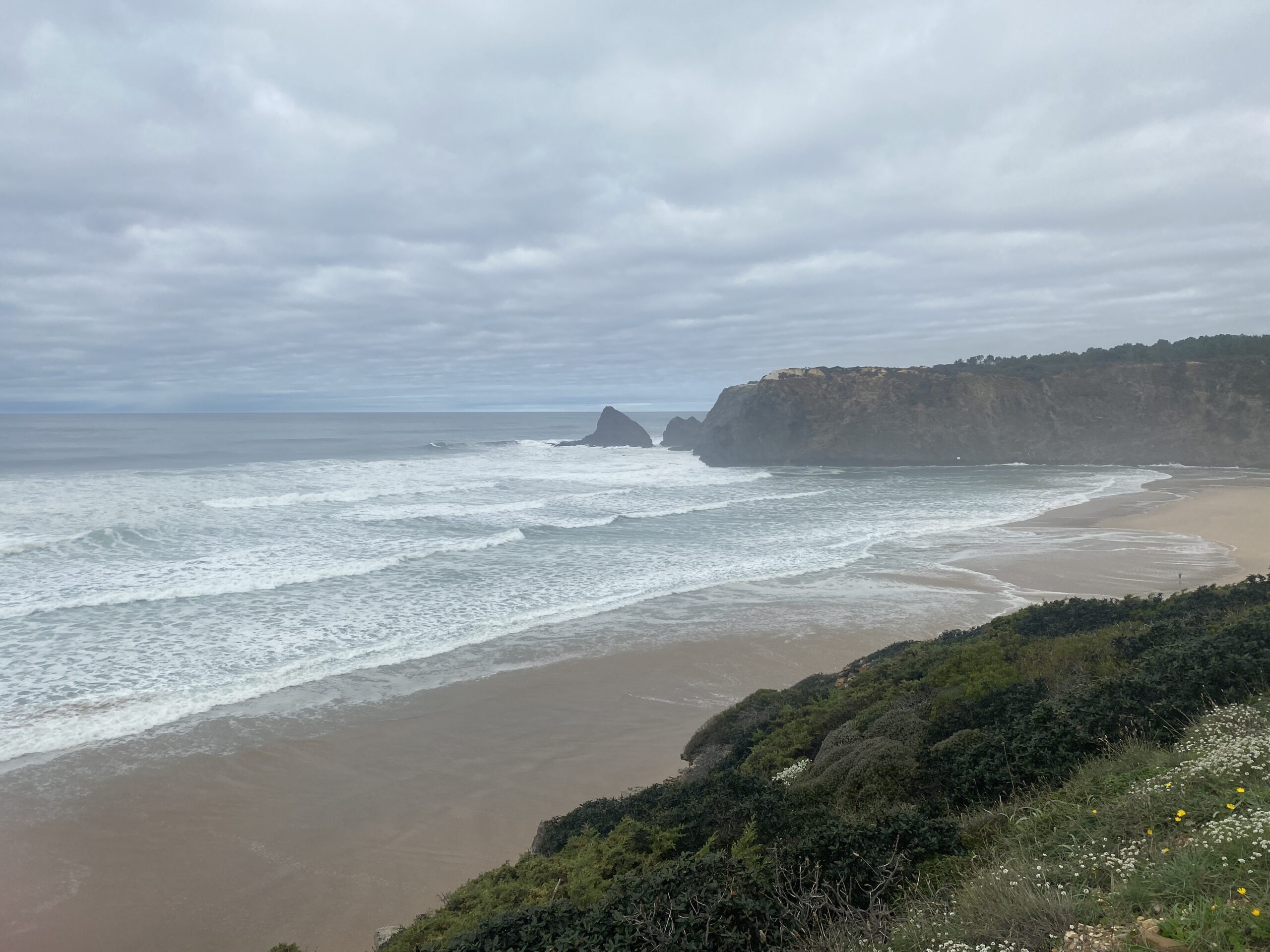 An der Westküste führt die Rota Vicentina – der Fishermen’s Trail – im Naturpark Costa Vicentina her. Einen Teil der 4 Etappen konnten wir so während des 14 km Fußweges genießen. Die Wanderung startete am Monte João Roupeiro (gefunden auf Komot) und führte uns entlang eines Bachlaufs über ruhig gelegene Felder und Wiesen, jedoch teils durch dichtes Gestrüpp, durch kleine Dörfer und einer wundervollen Mühle in Odeceixe, die wir sogar kostenfrei besichtigen konnten. Das Highlight wartete jedoch erst etwa ab der Hälfte der Wanderung auf uns: die Steilküste ab der Praia de Odeceixe. Hier zeigt sich die Atlantikküste von ihrer wildesten, aber auch schönsten Seite. Bereits aus der Ferne kannst Du das Donnern der Wellen hören und ich kann Dir sagen, der Anblick ist einfach atemberaubend. Wir konnten es uns nicht nehmen lassen auf eine der Spitzen einer der Steilküstenformationen zu klettern, um dort Rast zu machen. Der Rückweg verlief entlang der Steilküste über einen sandigen und teils dicht bewachsenen Weg – stets mit Blick auf die Küste und die peitschenden Wellen.