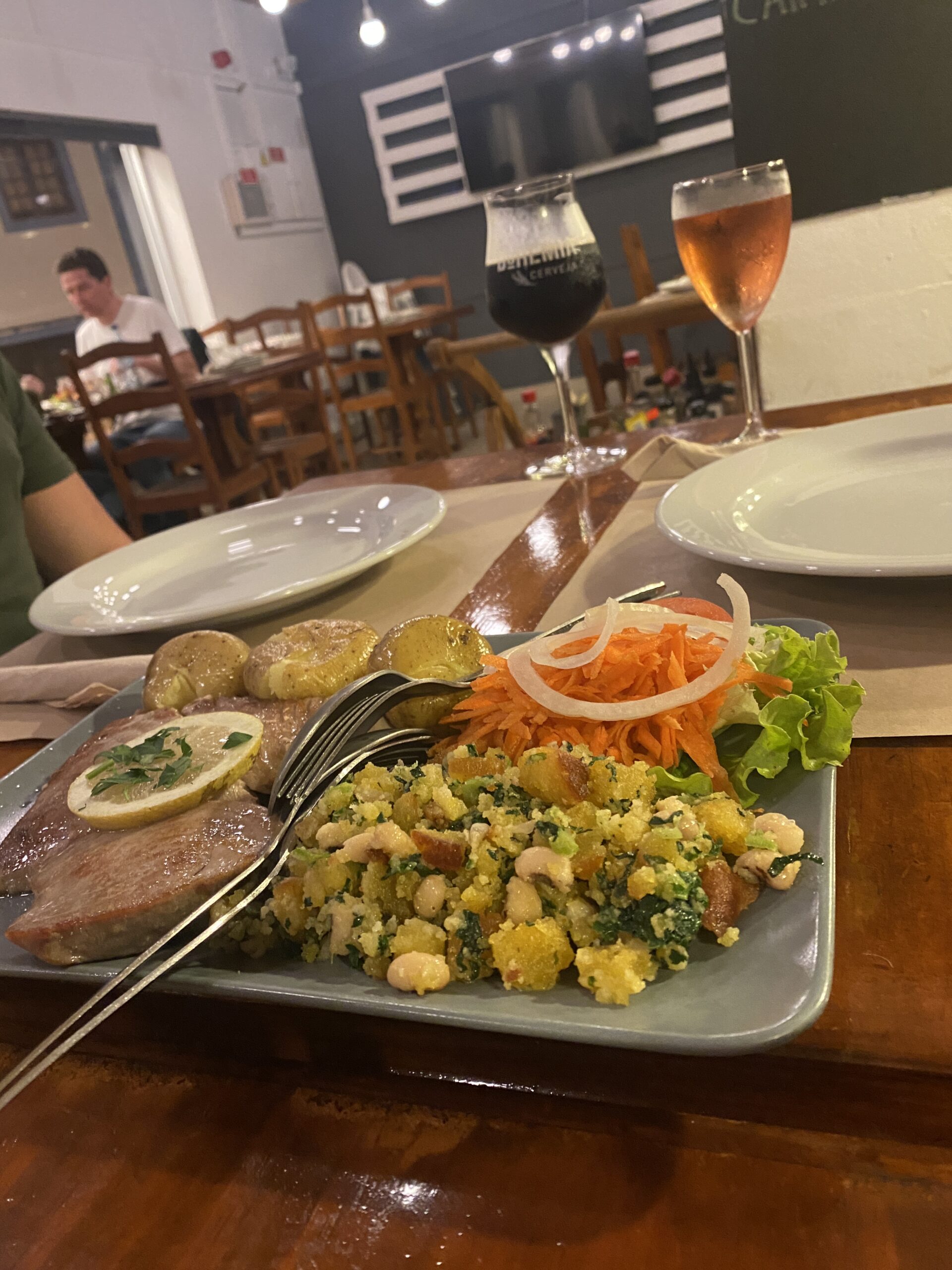 Nach dem Check-In im HS Milfontes Beach (94,00 € inkl. Frühstück) ging es auf die Suche nach einem Nicht-Touri-Restaurant mit gutem Essen. Fündig wirst Du im Restaurant Tasco do Largo ca. 5 Minuten zu Fuß vom Hotel entfernt. In dem kleinen gemütlichen Restaurant erlebst Du besten Service, wirklich freundliches Personal und verdammt gutes Essen für einen wirklich fairen und kleinen Preis (ca. 18,00 € p.P.). Empfehlen können wir Dir das Tunfischsteak oder das Black Pork! Wer das Getränk noch nicht kennt, sollte auch unbedingt Martini mit Bier probieren. Andernfalls bleib einfach bei einem leckeren Black Beer. Die Bedienung wird dich fragen, wie viel Schaum dein Bier haben soll, ganz ehrlich!