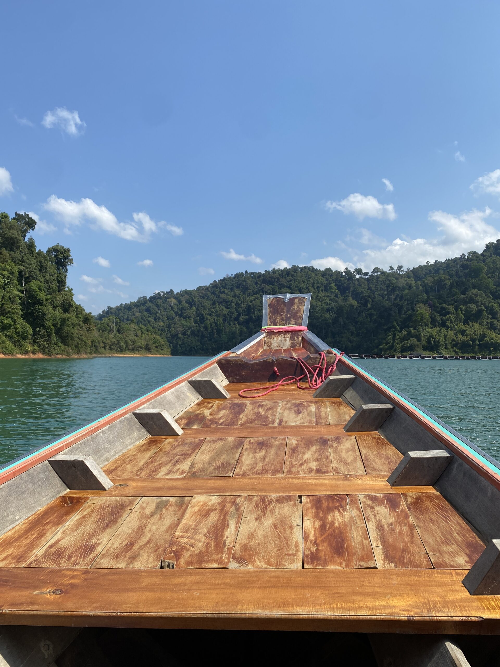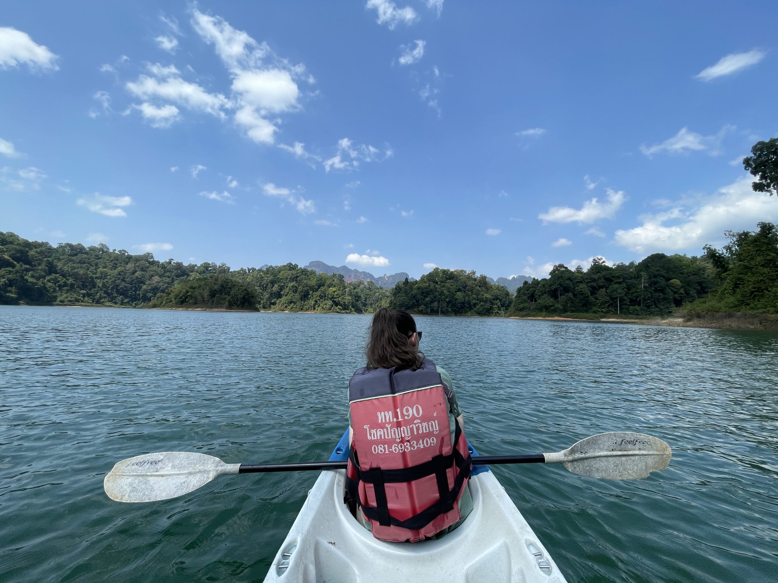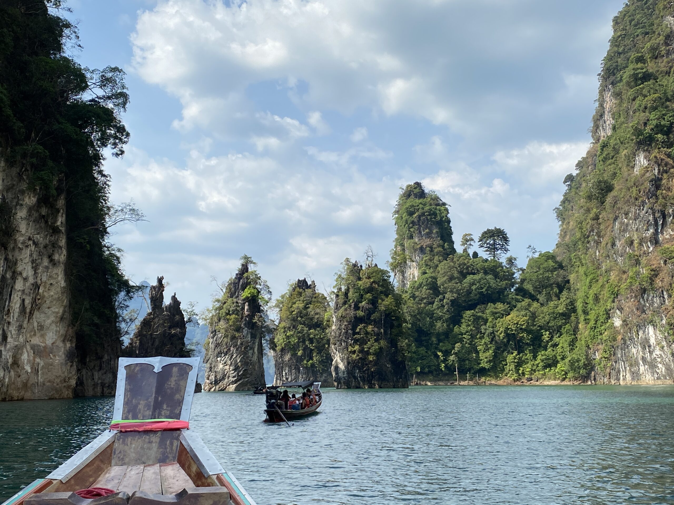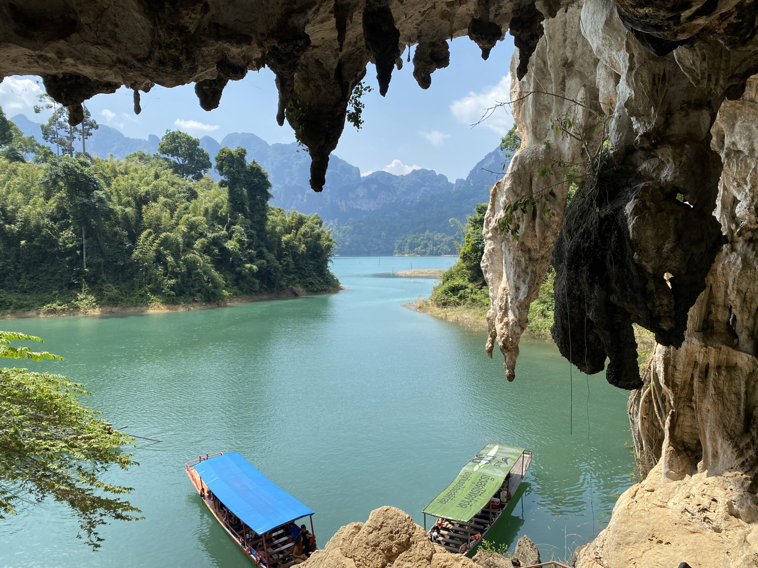 Heute, am 01. März und dem dritten Tag im Khao Sok Nationalpark haben wir eine Tagestour (1.500 Baht, rund 40€pP) gebucht. Spoiler vorweg: Die Tour ist ein absolutes Muss, wenn man ein paar Tage hier im Nationalpark verbringt. Sie vereint viele Aspekte und Sehenswürdigkeiten, die es sonst nur auf einzelnen Touren zu sehen gibt! Pünktlich um 8:30 Uhr wurden wir mit einem Minivan vor unserer Unterkunft abgeholt, mit uns nur 11 andere Personen, was für diesen Ausflug eine absolut überschaubare und angenehme Gruppengröße ist. Nach einer knappen Stunde erreichten wir den Ratchaprapha Stausee. Dieser war früher ein riesiges Tal, zur Energiegewinnung wurde jedoch ein Staudamm gebaut und in den fünf Jahren danach der See geflutet. Aus einem klassischen Langboot ging es die ersten 45min über den See zu einem schwimmenden kleinen Restaurant, an dem auch 30 schwimmende Unterkünfte für ausgefallene Übernachtungen gebucht werden können. Hier hatten wir kostenlos die Möglichkeit mit einem Kanu den See zu erkunden, was wir natürlich sofort taten. Nach einer Stunde praller Sonne gönnten wir uns noch eine „Abkühlung“ im See, bevor uns das im Tagesausflug beinhaltende Mittagessen gab. Mit vollen Bäuchen ging es zurück auf das Langboot, um nach weiteren 40min auf dem See den zweiten Punkt auf unserem Programm zu erreichen, eine kleine, aber durchaus spannende Höhle, die wir gemeinsam mit Wim, unserer englischsprachigen Reiseführerin, besichtigten. In der Höhle konnten wir, mit Taschenlampen ausgestattet, diverse Spinnen (angeblich nicht giftig, auch wenn sie größer als alle Spinnen in Deutschland sind) und einige Fledermäuse entdecken. Nach unserer Höhlenwanderung fuhren wir weitere 10min zu unserem letzten Tagespunkt, einer 40min Wanderung durch den Dschungel. Diese führte uns durch dichte Bambussträucher und durch kleine Bäche entlang eines schmalen Trampelpfades, auf dem es zahlreiche Insekten und neue Geräusche zu entdecken gab. Zur Höhlenerkundung und zur Wanderung sei gesagt, dass beim Buchen der Tour auf geeignete Kleidung und festes Schuhwerk hingewiesen wird. Dies interpretieren erfahrungsgemäß Menschen sehr unterschiedlich. So konnten wir neben den einheimischen Tieren auch noch einen Blick auf das mutige Flip-Flop Höhlentierchen und das wenig scheue Dschungel-Bikini Mäuschen (alias String-Tierchen) erhaschen.