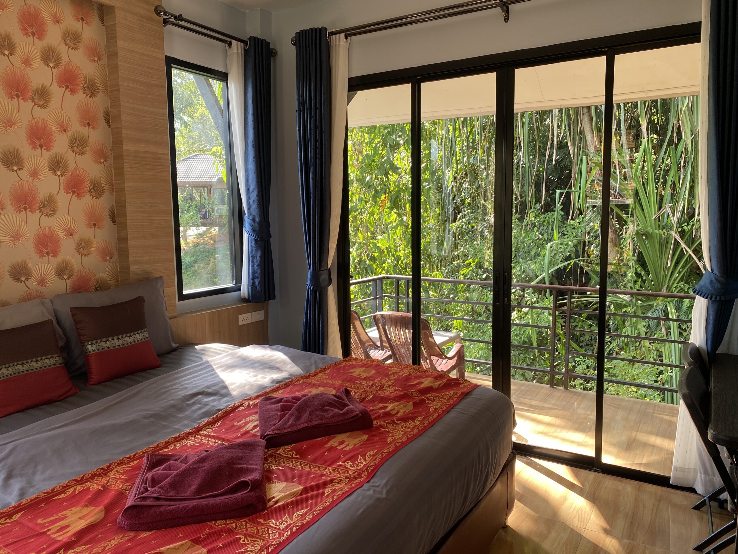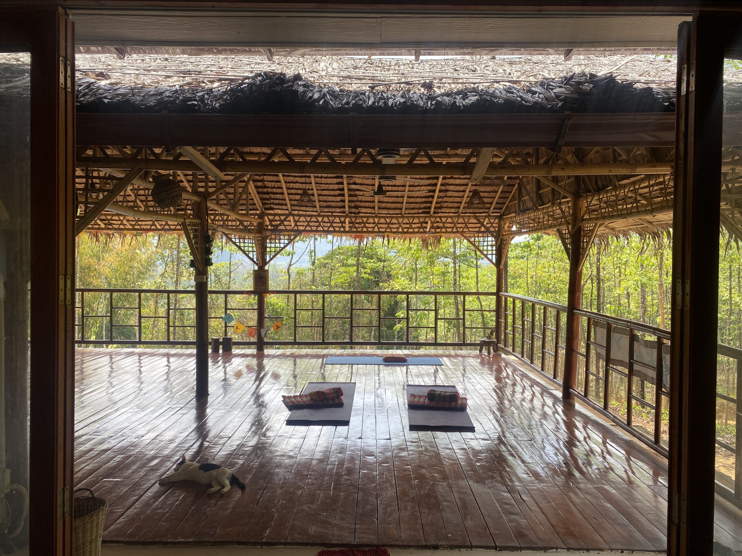 Nach einer kurzen Rast auf unserem Balkon, der einen wundervollen Blick in den Regenwald und die dort lebenden Affen bietet, kamen wir auf unseren Plan B für den heutigen Tag. Schnell und unkompliziert konnten wir per WhatsApp und Paypal (14€ p. P.) ein Meditationskurs im nahegelegenen Khaosok Yoga buchen. Eine Stunde später machten wir uns auf einen 40 minütigen Spaziergang zu dem Yogastudio. Wir wurden freundlich begrüßt und saßen auch direkt auf der Yogamatte und bekamen eine Einführung in den buddhistischen Lebensstil und Glauben und natürlich in die Theorie der Meditation. Der Ausblick von der offenen Terrasse auf die Landschaft sind es schon wert hier hinzukommen. 30 Minuten stille Meditation im Sitze, eine vertiefte Wahrnehmung, aber auch ein eingeschlafenes Bein später wusste ich, meditieren ist nichts für Weicheier. Weitere 15 Minuten Meditation im Gehen und einem fest verankerten Mantra „Phu ththo“ später, konnten wir unsere Meditationsklasse abschließen.