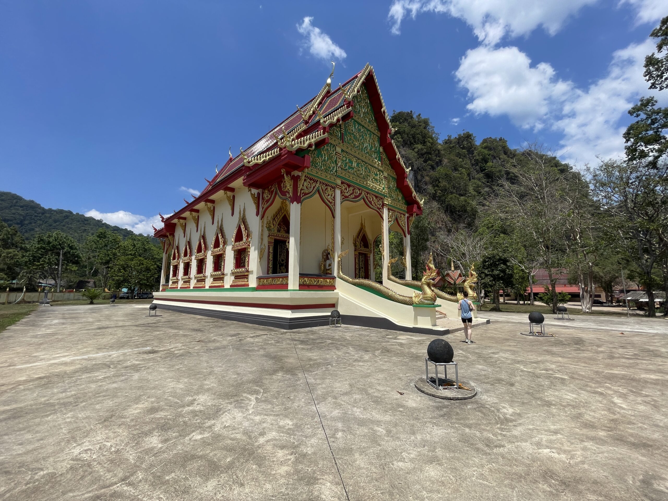 [28. Februar – 03. März 2024] Unser Urlaub sollte so richtig im Nationalpark Khao Sok starten. Unsere Tour führte uns daher per Inlandsflug von Bangkok nach Surat Thani Flughafen (Viet Air ca. 50€ p.P.), vom Surat Thani Flughafen nach Surat Thani City per Mini-Van (Phantip 30 Minuten 5€ p.P.) und dann zum Khao Sok Nationalpark per Reisebus (12Go 2,5 Std 7€ p.P.). Bevor wir in den Reisebus stiegen, konnten wir uns aber noch einen Eindruck von Surat Thani machen, den ersten Tempel besichtigen und durch Gassen schlendern.
